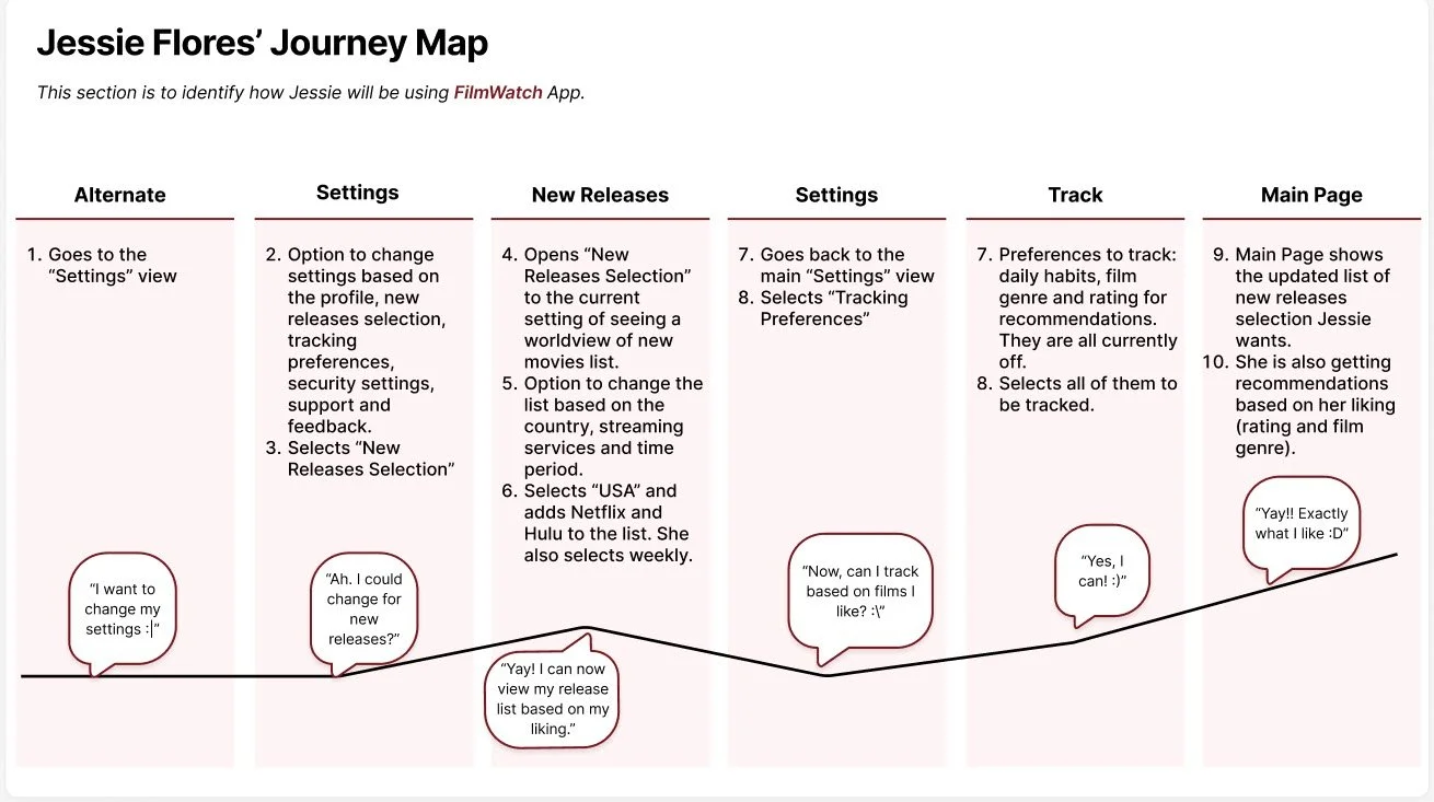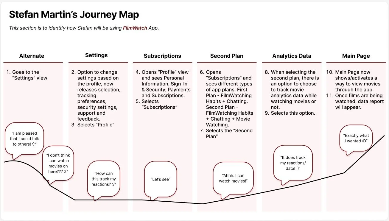 The empathy maps and the interviews I conducted for them helped me with my target personas and their journey maps. The first persona occasionally watches films. The second persona watches films for his work/podcast. The third persona needs this application to help her focus on her daily habits than watching films.