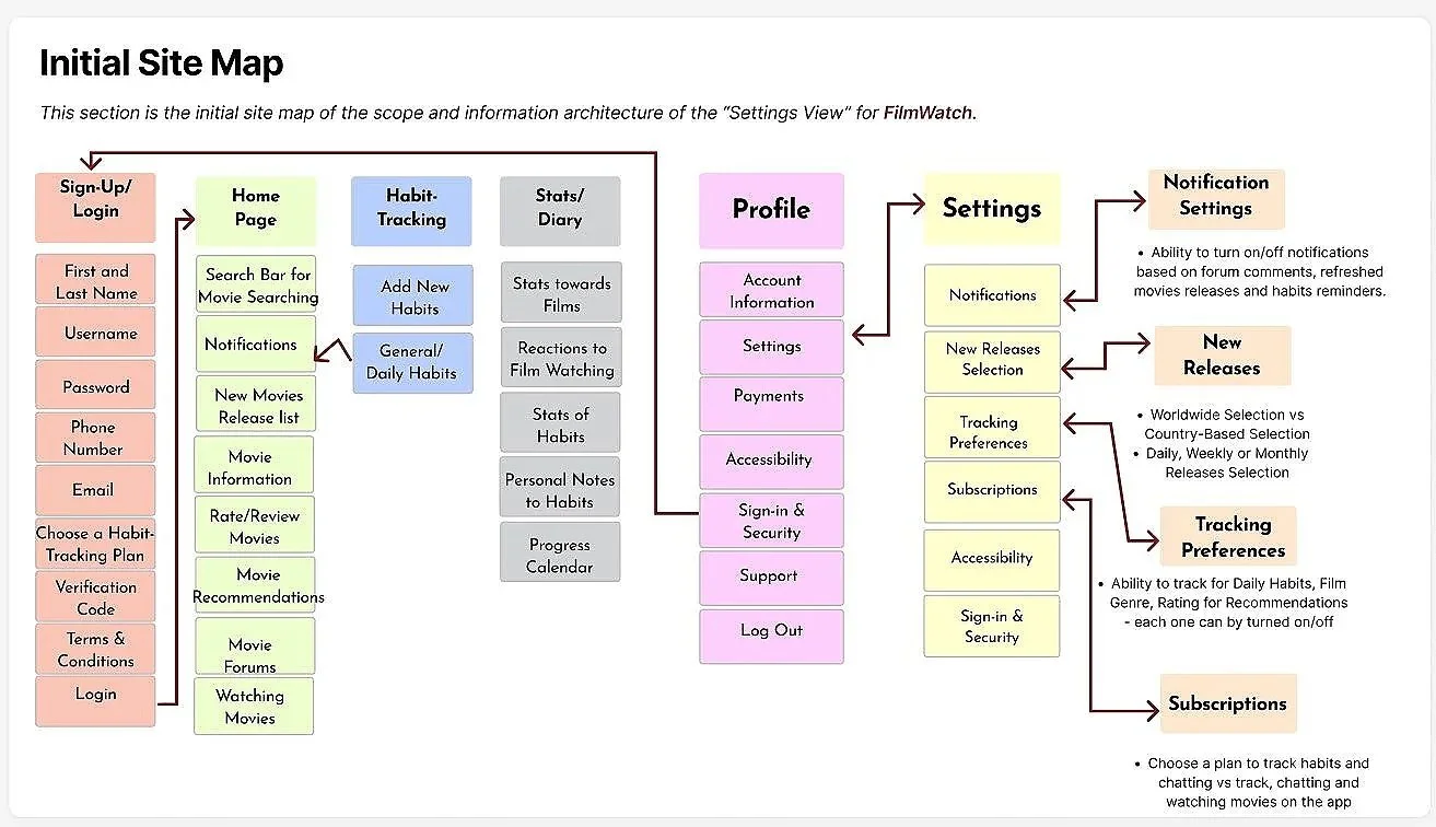 Having all the information I needed from the interviews and target users and their journey maps, it helped me create the site map for the FilmWatch application. I first created the site map as an overlook on how the FilmWatch should work while in the update version focuses on the “Settings View” section of this application.